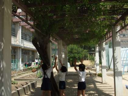 休み時間には、藤棚のミストに気持ちよさそうにあたる子どもたちがいました。