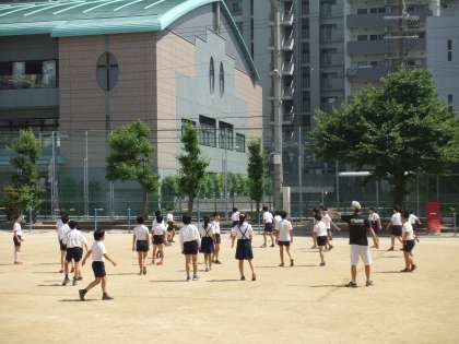運動場では、高学年が暑さに負けずにドッジボールをして遊んでいました。