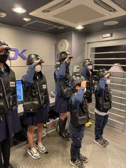 ヘルメットを被り、防弾チョッキをつけています。警棒を持って「ヤー!」と大きな声で。基本動作の練習です。