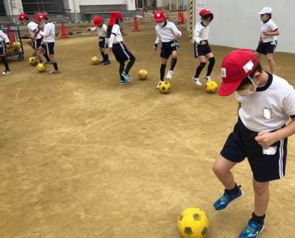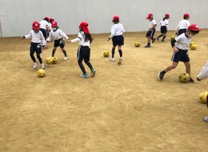 雨が降るまで運動場に出て、ボールけり遊びをしました。