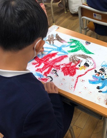 「すきなものに乗って、行ってみたい場所へ行く」というテーマで絵を描きました。