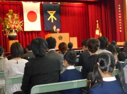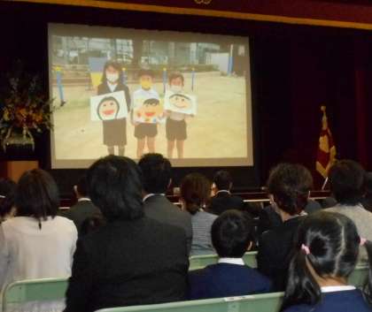 校長先生の話を聞いたり、小学校の校歌を聞いたりしました。