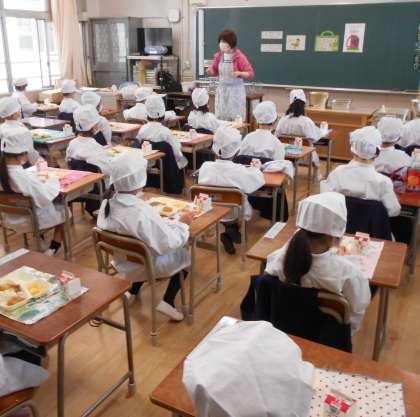 楽しい給食の時間ですが、全員前を向いて静かにたべていました。食べるとき以外はマスクをして過ごしました。