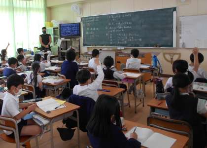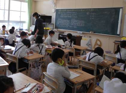 式の中に「0」が入るかけ算の仕方を学習しました。3×0や0×3の答えはどんな数になるのかを考え、近くに座っている友だちと一緒に自分の考えを交流しました。かけ算では、どんなに大きな数であっても、式に0があると答えが0になることを学びました。