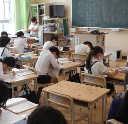 2年生で学習した「九九」の復習をしました。「1のだん」から「9のだん」までの式をプリントに書いて練習しました。これからの算数科の学習で「九九」は何度も使う基本的な計算です。マスターできるように何度も練習しましょう!