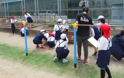 運動場に出て、生き物を探しました。学習園の近くで虫や花などを見つけました。見つけた生き物の名前と見つけた場所を「記録カード」に記入しました。