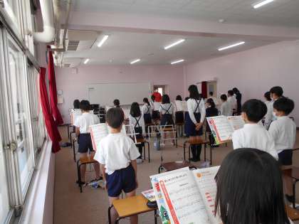 声の出し方を意識しながら歌いました。歌うときの姿勢や目線をに気をつけると、「元気で」「美しい」声が出るようになりました。
