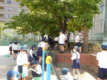 運動場に出て、植物の観察をしました。虫眼鏡を使って「サクラ」や「イチョウ」の様子を見ました。気づいたことをカードに記録しました。