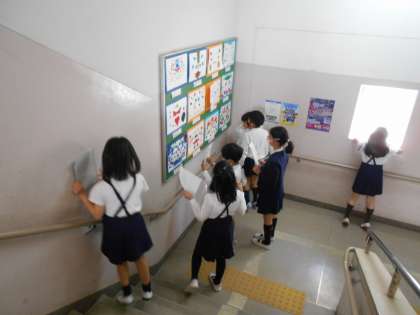 先日完成した作品の鑑賞をしました。自分の作品で「頑張ったところ」や「工夫したところ」を振り返ったあと、友だちの作品の「よいところ」や「まねしてみたいところ」を見つけて、鑑賞カードに書きました。