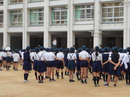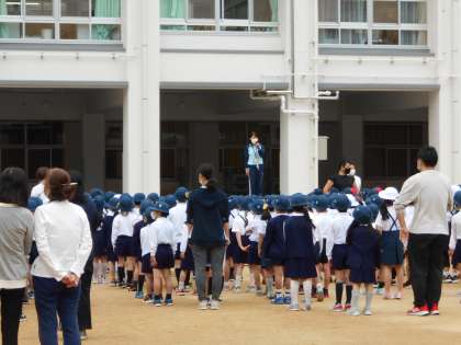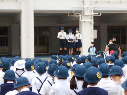 運動場で「全校朝会」をしました。校長先生から、「自分がされていやなことは、人にはしない。」、「自分が言われていやなことは人には言わない」など、大切なお話を聞きました。