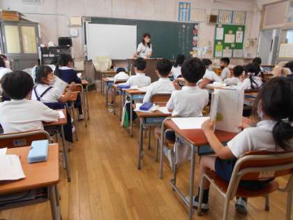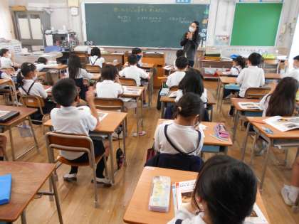 日本各地や世界で歌われている曲を聞きました。フィリピンの「ティニクリン」、デンマークの「エースオブダイヤモンド」、沖縄県の「とうしんドーイ」の曲を聞いて、手拍子でリズムをとったり、各地の曲の雰囲気を味わったりすることができました。