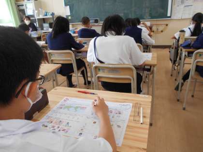 リスニングのテストに取り組みました。聞こえてくる会話や音声をよく聞いて、問題に答えました。答えとなる言葉を聞くために耳を澄まして取り組むことができました。