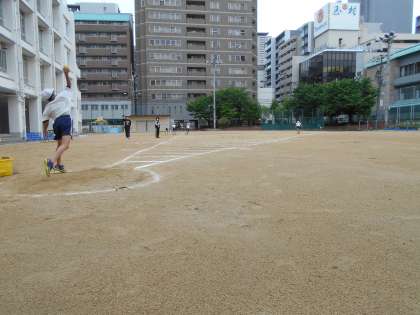 新体力テストの1つである「ソフトボール投げ」をしました。ラインから足やボールが出ないように、力いっぱい投げました。雨が降っていない間にみんなが測定できるように素早く行動できました。