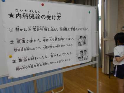 3年生1組から3組は、午後から「内科健診」がありました。聴診器で心臓の音を聞いてもらったり、背筋の様子などを診てもらったりしました。自分の順番が呼ばれるまで、「内科健診のやり方」のポスターを見ながら静かに待ちました。教室では、デジタルドリルなどを使って学習しながら待機することができました。