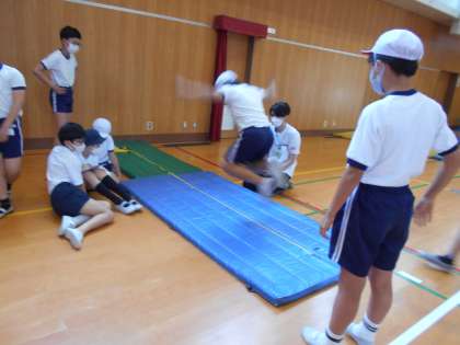 「新体力テスト」の「立ち幅跳び」、「反復横跳び」、「上体起こし」に取り組みました。昨年の記録を上回るように力いっぱい取り組むことができました。