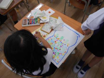 小さく切った画用紙とクレパスを使って、「キャンディーボックス」を描きました。クレパスで塗ったところを指で広げて、きれいで甘そうなキャンディーをたくさん描くことができました。