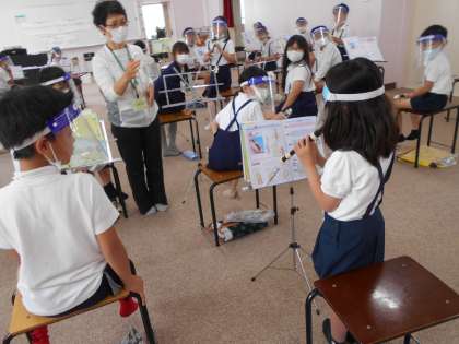 「シ」の音を吹く練習をしました。指の使い方や息の入れ方を知り、リズムに合わせて「シ」の音を出すことができました。