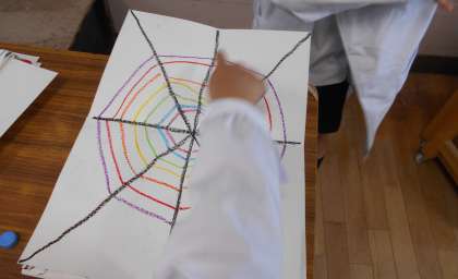 クレパスで「くものす」を描きました。まっすぐな線を描いていくと、「くものす」ができました。たくさんの色のクレパスを使い、きれいな「くものす」を描くことができました。