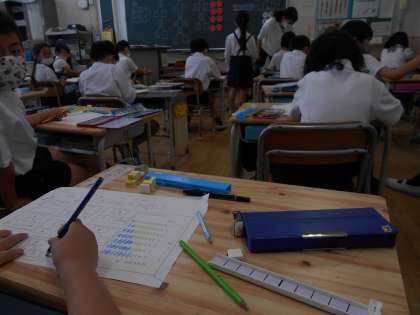 「8」はいくつといくつに分けることができるのかを考えました。おはじきやブロックを使って、「2」と「6」や、「5」と「3」などの分け方をワークシートに書くことができました。