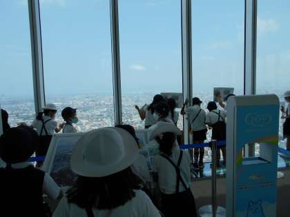 社会見学であべのハルカスに行きました。高い所から大阪市の様子を見て、特色のある場所を見つけ、東西南北によってどんなちがいがあるかを見つけました。西側は海が広がっている、南側は低い家が多いなどと気が付いたことをメモしました。駅や電車、館内のルールを守って、見学することができました。