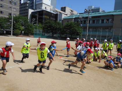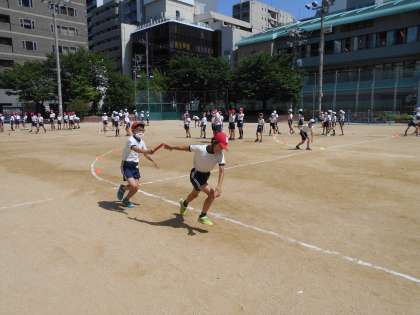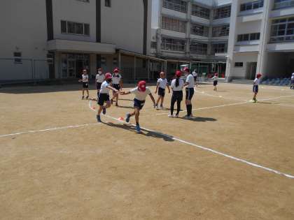 リレーはバトンのパスが重要になってくるので、グループに分かれてバトンパスの練習をしました。