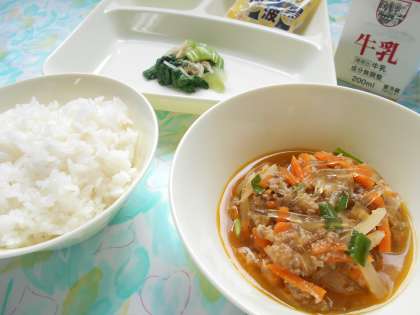 小学校の給食では、じゃがいものでんぷんから作られた「はるさめ」を使っています。