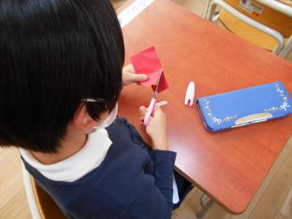 赤色の折り紙を丸く切って顔を作り、紫色の画用紙を細長く切って耳をつけました。