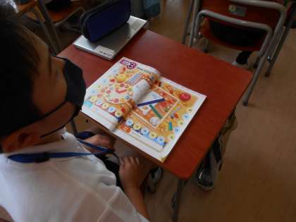 先生が話す英語をよく聞いて指示されたものを探し、数を英語で答えることができました。