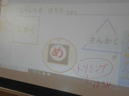 教室の中から「丸いもの」や「四角いもの」を探して写真を撮り、資料に貼り付けて発表しました。