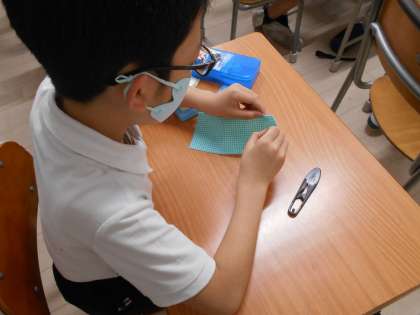 「穴が小さくて糸が入らない…。」「うまく結べない…。」と細かい作業で大変そうでしたが、最後まで頑張って取り組みました。