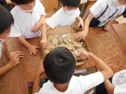 段ボールの中に入っているコインを1回だけ片手ですくい、何枚すくえたかを数えます。