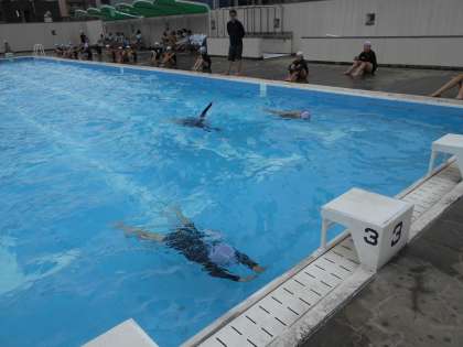 泳ぎ方に指定はなく、クロールや平泳ぎなどの泳ぎやすい方法で25mを目指しました。