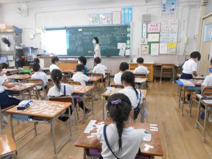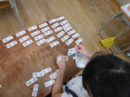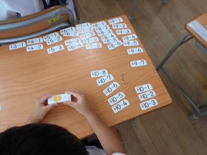 机の上にカードを並べて、答えが同じになる式を見つけました。