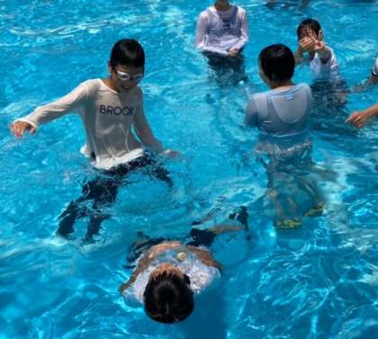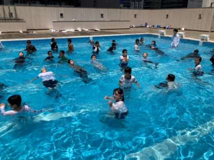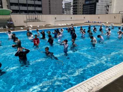 そして、川の氾濫や大雨による洪水などの災害時に服を着ていたとしても、ペットボトルなどで体を浮かして命を守れることを知り、プールで実践しました。