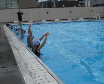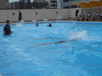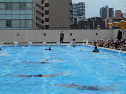肘や膝を伸ばして真っすぐな姿勢になり、自分のお腹を見るようにあごをひくことに気をつけて泳ぎました。