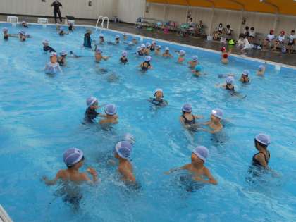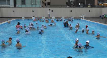 はじめに、水面をたたいて水しぶきをあげたり、お互いに水を掛け合ったり、「お地蔵さん」になって掛かってくる水を受けたりして、水慣れをしました。