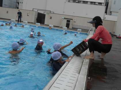 水中をよく探し、プールの中に沈んでいる小物を、潜って拾いました。
