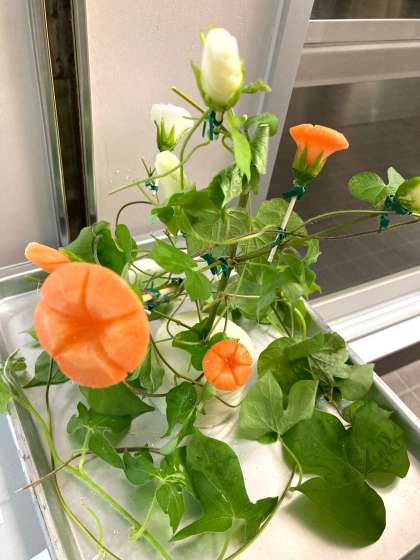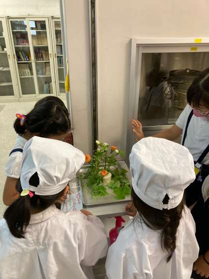 給食室前に、給食調理員さんが作ったいろいろな野菜を使ったオブジェが飾られました。