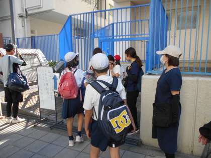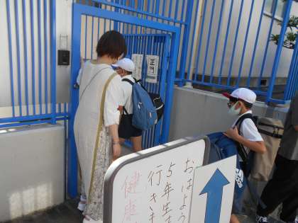 林間学習が始まりまった5年生の児童が登校するようすです。
