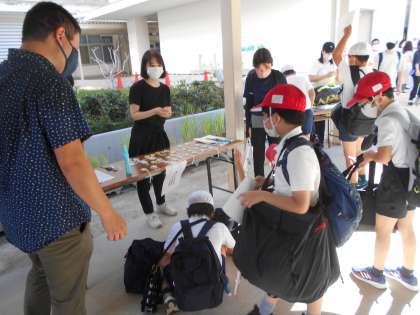 大きなカバンに名札を付けて、自分のクラスが並んでいるところへ向かいます。