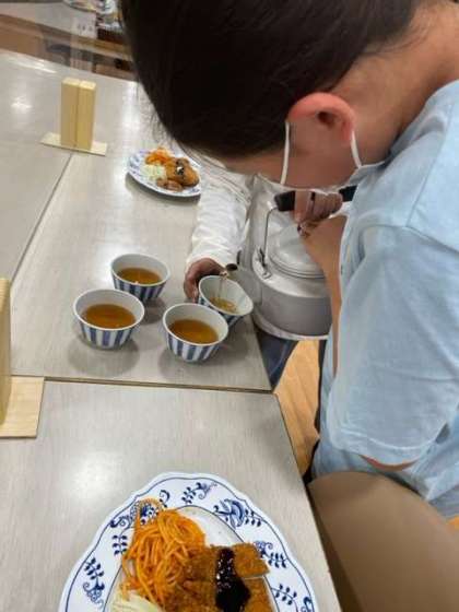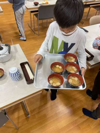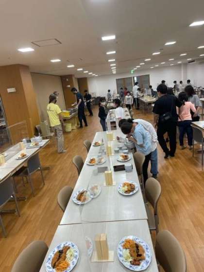 食事係が夕食の準備中です。ご飯と味噌汁、お茶を配膳しています。慎重に運んでいます。