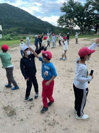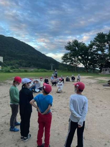 キャンプファイヤー係が先にファイヤー場に来てリハーサルをしています。
