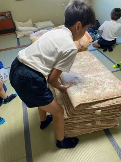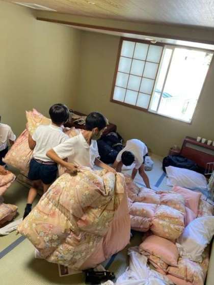 部屋の片付けと荷物整理の時間です。協力してシーツをたたんでいます。きれいに速くできますね。