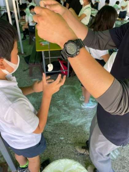 出来上がった自慢の作品を先生や友達に見せています。