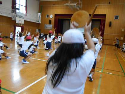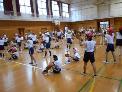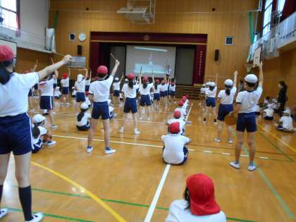 動画や先生のお手本を見ながら、団体演技の練習をしました。