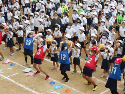 今朝、児童集会で「ボール送りゲーム」をしました。