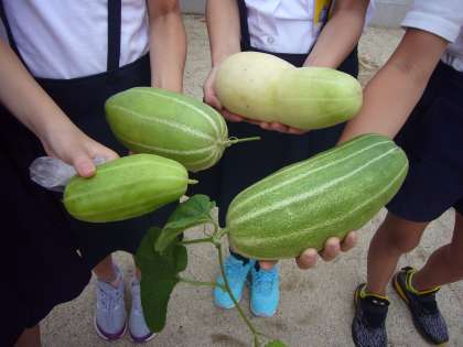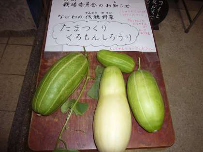なにわの伝統野菜である玉造黒門越瓜(たまつくりくろもんしろうり)をはじめ、オクラ、ナスなどを収穫することができました。