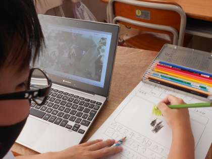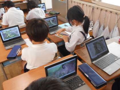 学習園で育てたキュウリやナスを写真で撮り、観察カードに記録しました。