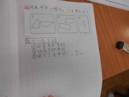 など、友だちと話し合いながら四角形の特徴を見つけることができました。