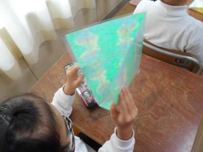 前回のうめのみタイムで作った折り染めが乾いたので、ラミネートしてクリアファイルを作りました。
